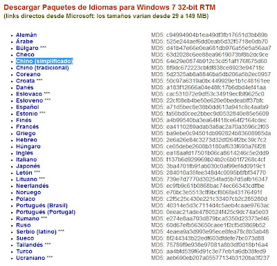 En nuestro caso, a fecha actual nos dirigiremos al enlace «para Windows 7 32-bit RTM (sin un SP)«, que es la version que nos corresponde del paquete MUI.